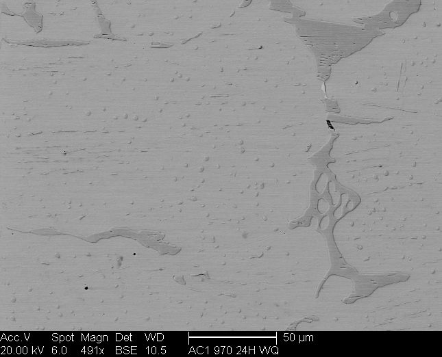 | Structure: spheroidite Echelle: 50 µmGrossissement: 491 xDétecteur: BSEDésignation: AC1 970C 24H WQ Temps de recuit: 24 H Température recuit: 970C Méthode refroidissement: WQ |