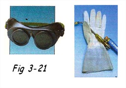 - Toujours utiliser des EPI ( Equipements de Protection Individuels ) Fig 3-21 : gants ( CE ), lunettes spécifiques avec verres teintés noir avec numéro d’échelon suivant EN 169 ( ex. qualité 6 pour débit d’acétylène compris entre 200 et 800 l/h ).